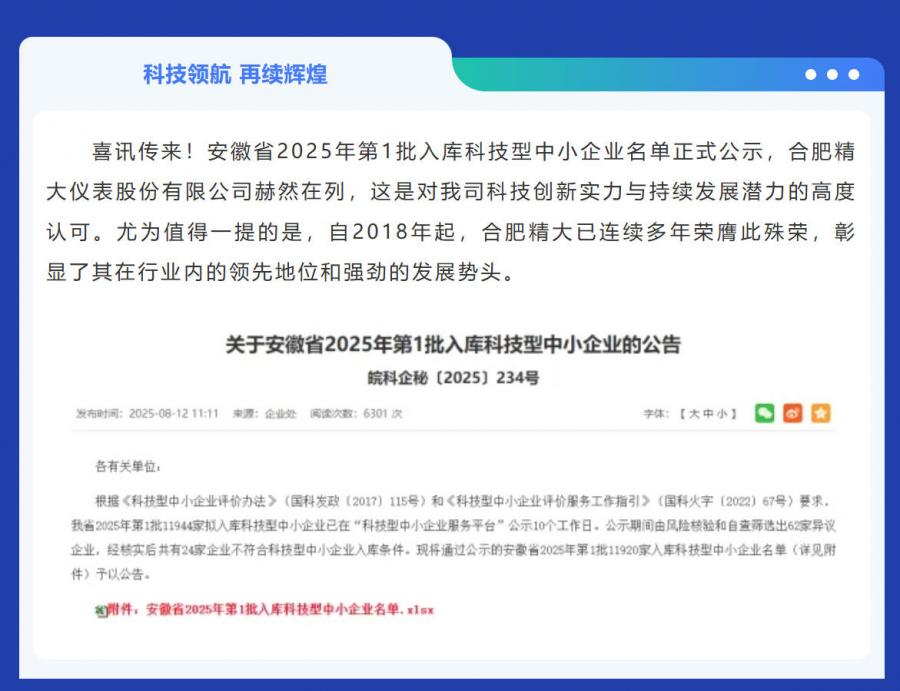 科技领航,再续辉煌!——合肥精大仪表股份有限公司再次入选安徽省科技型中小企业名单