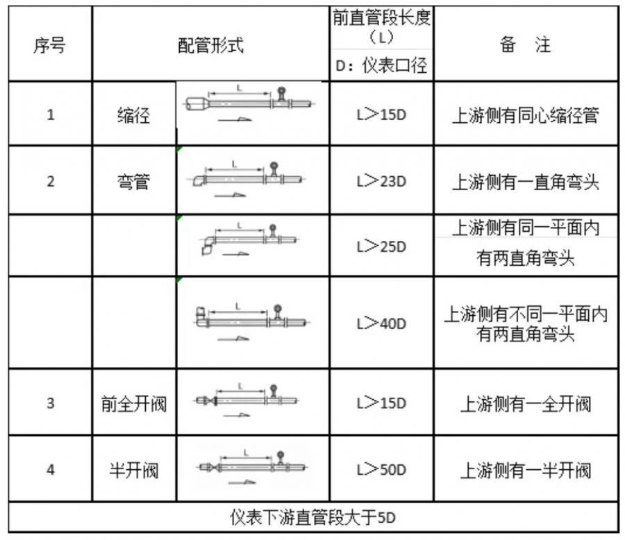 2.涡街流量计的上游侧和下游侧应有较长的直管段。其上、下游直管段长度根据管道状况不同而不同,直管段的具体安装长度和要求见下表。